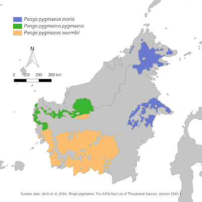 Di Kalimantan Timur (habitat P. p. morio), prediksi kepunahan lokal untuk populasi orangutan sangat tinggi di 10 tahun kedepan. Resiko konflik dan prediksi pembunuhan orangutan yang tinggi berkaitan erat dengan konversi hutan dan degradasi habitat yang terjadi di area ini.